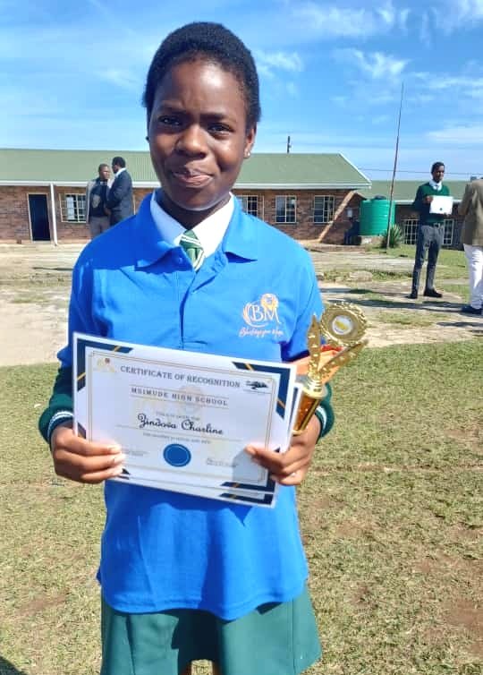 Isithombe : uShindova Charlene obaqwaqwade amakhanda ka Grade 9 wahlomula ngendondo nezitifiketi.