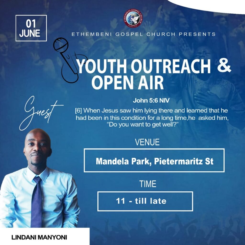 Khonamanjalo uMnu Skhakhane ulishayele ihlombe lohlelo athe kumjabubulise kakhulu njengelunga lebandla makuqalwa izinhlelo ezinjengalezi ezohlanganisa intsha kuphinde kuqwashiswe ngobungozi bezidakamizwa, ubonge kakhulu kuMphostoli N.J Shezi nakwithimba ahlela nalo,aqinisekisile ukuthi lohlelo uyalweseka kakhulu unxusa abantu abasha bafike ngobuningi babo. Lenkonzo izobanjelwa eMandela Park kuPietmaritz Street eMgungundlovu ngoMgqibelo (01 June 2024) izoqala ngehora lushuni ekuseni nanye kuyakwihora lesine ntambama.
