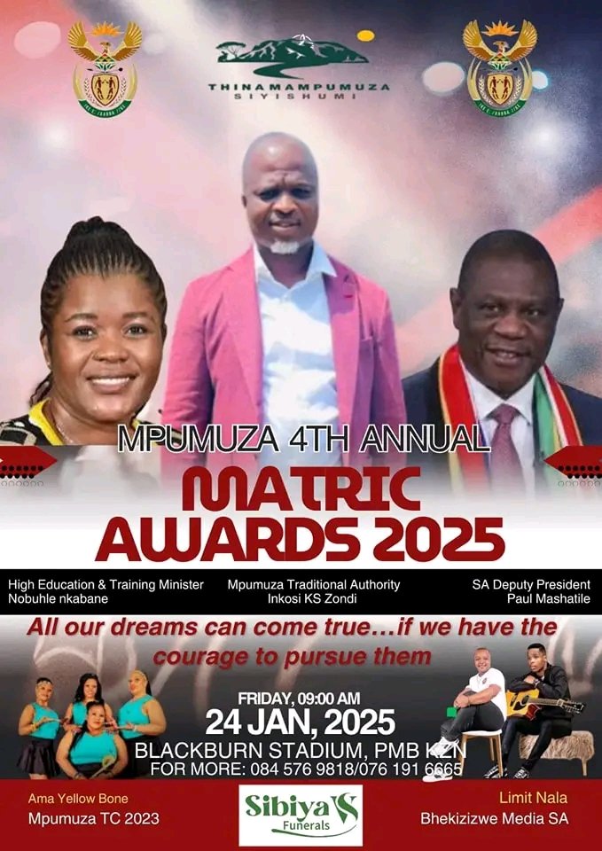 Lomcimbi obizwa nge Mpumuza Matric School Awards usudonse ngisho izinkumbi zabantu eNingizimu Africa, kulindeleke ukuba usingathwe nawuSekela Mengameli wezwe uMnu Paul Mashatile njengoba namuhla kuphothulwe izinhlelo abezinhlaka nabemnyango mebekhona kanye nabasuka kwihhovisi likaSekela Mengameli mebekhona emhlanganweni obuholwa iNkosi K. S Zondi yesizwe SaMaMpumuza eMgungundlovu, Kwa Zulu Natali.